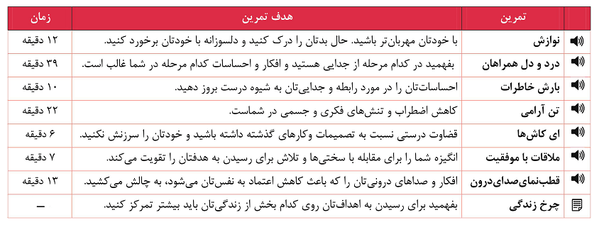 بخش آموزشی دوره شامل 7 ساعت و 15 دقیقه آموزش صوتی (11 جلسه آموزشی و 8 تمرین روانشناختی) و دو قسمت متنی-تصویری میباشد. در ادامه در مورد محتوای جلسات و نحوه دریافت فایلهای آموزشی دوره توضیح میدهیم.