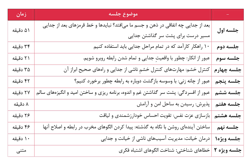 - آموزشهای این دوره نظرات یک فرد خاص نیست، بلکه حاصل تجربه و مطالعه روانشناسانی است که مدتها در این حوزه تحقیق و پژوهش کردند و سابقه طولانی در زمینه مشاوره جدایی و ضربه عاطفی دارند.